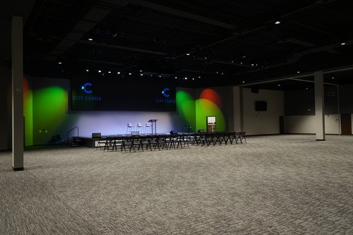 Our commons area is set up with tables, chairs and couches for an informal gathering place. We can service 800 individuals in theatre style seating or 400 individuals with banquet style seating in the auditorium. Our auditorium is set up with the latest technology, including a state of the art 32 ft screen with mirroring screens, incredible sound quality, and much more.